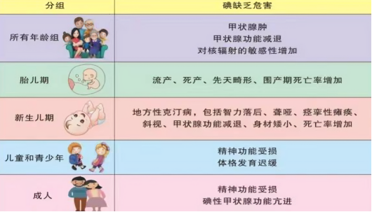 碘缺乏病是由于自然环境中的水、土壤、空气等碘含量缺乏,人体从外界摄入的碘不能满足正常机体需要而发生的一系列疾病,缺碘发生的时期不同,对人体的危害不同。
