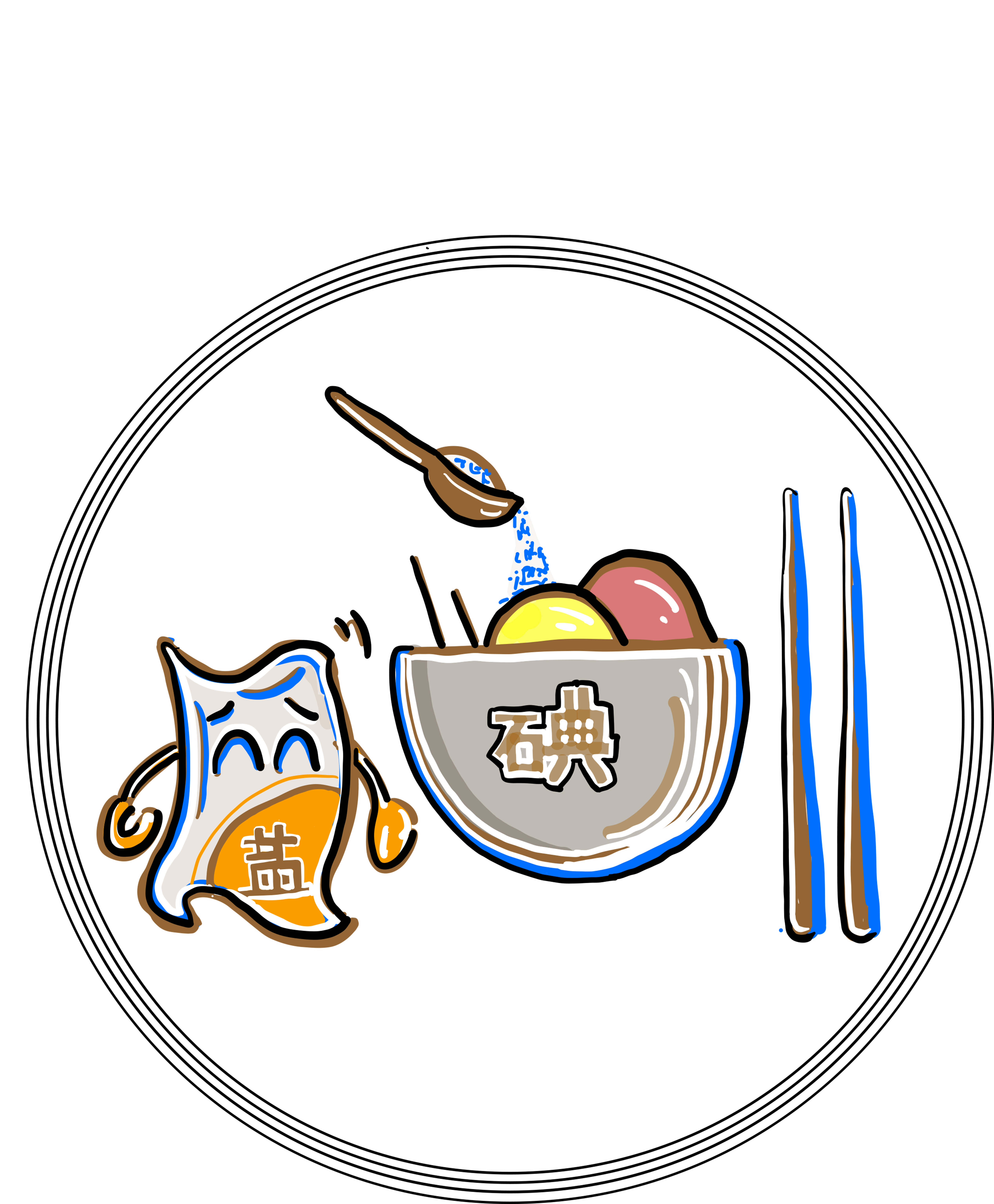 此LOGO以餐具为元素,用勺子把加碘食盐洒在食物上,旁边搭配着筷子,呼吁食用碘盐。用黄色作为点缀,黄色有着对食物的渴望,蓝色是海的颜色,也代表着海产品是富含碘的食物。蓝色和黄色搭配加上棕褐色和黑色,白色的阴影对比,使标识造型灵动,便于大家辨识和传播。